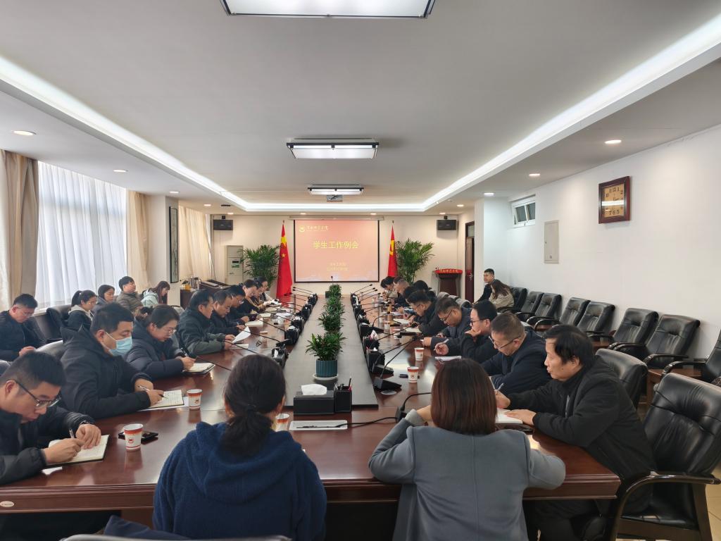 常青林围绕校园安全稳定、学生日常管理、加强学风建设、强化就业指导等工作开展统筹部署。他强调,要夯实安全责任,守牢安全底线。以专项检查为抓手,加强日常巡查与隐患排查,重点覆盖消防安全、交通安全、宿舍安全等关键领域,建立隐患台账与闭环整改机制。要狠抓学风建设,营造良好风气。依托“一站式”学生社区和第二课堂,紧密衔接纪律约束与学业帮扶,把人才质量提升好,把良好学风塑造好。要聚焦五育并举,形成育人合力。打破工作壁垒,形成协同育人合力,将思政教育、文化培育、体育美育浸润、劳动实践有机融入学生成长全过程。要强化就业指导,提升就业质量。清醒认识当前就业形势,研判行业发展趋势与用人单位需求。通过系统分析往年就业数据、针对性优化就业指导服务,拓宽就业渠道,着力提升毕业生就业质量与就业满意度。